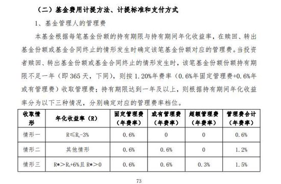 该基金的费率模式为,投资者持有不满一年按1.2%年管理费率收取;持有满一年后,费率将根据持有期间年化收益率分三档调整:当收益率超越业绩基准6%且为正时,适用1.5%的升档费率;若收益率低于基准3%,则适用0.6%的降档费率;其他情况按基准档1.2%收取。
